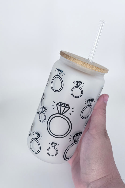 Smiley Face Glass Ice Coffee Cup, Beer Can Glass, Libbey Glass with Bamboo Lid and Straw, Frosted Glass Tumbler