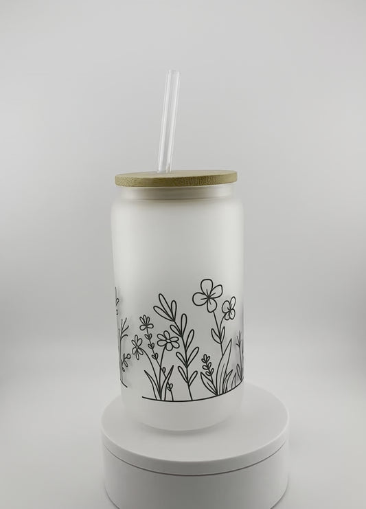 Flower Ice Coffee Cup, Flower Frosted Beer Can Glass with Bamboo Lid and Straw, 16oz Frosted Glass Tumbler, Gift for Teen, Gift for Her