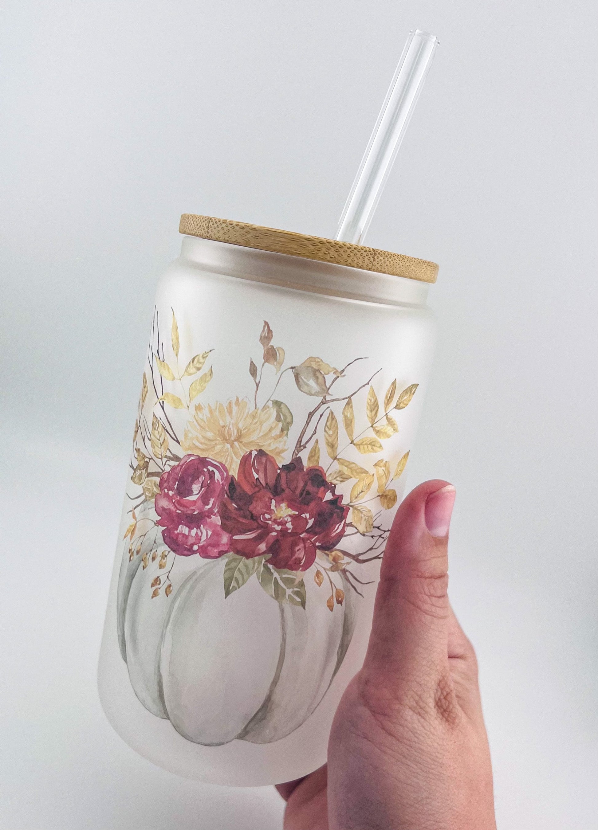16oz Fall Glass Can with Bamboo Lid and Straw