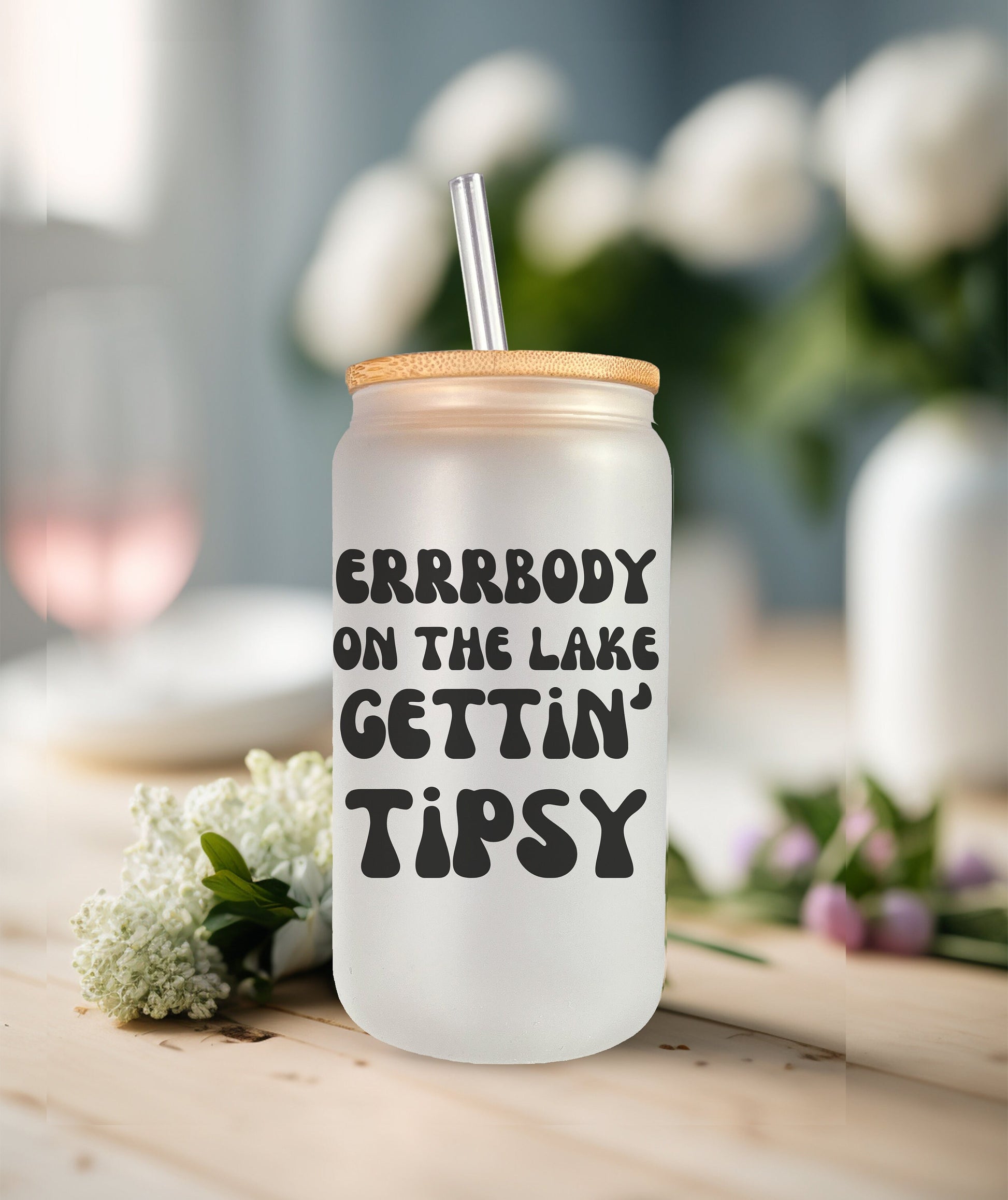 Errrrbody on the lake getting tipsy Glass Cup is a handcrafted, 16 oz can-shaped glass that is perfect for all types of beverages. It comes with a bamboo lid with silicone rubber seal and a plastic straw. The image on the glass is not vinyl and it will not peel as it is permanently cured onto the glass. This glass is the perfect gift for anyone who loves lake life and wants to enjoy their drinks in style.
