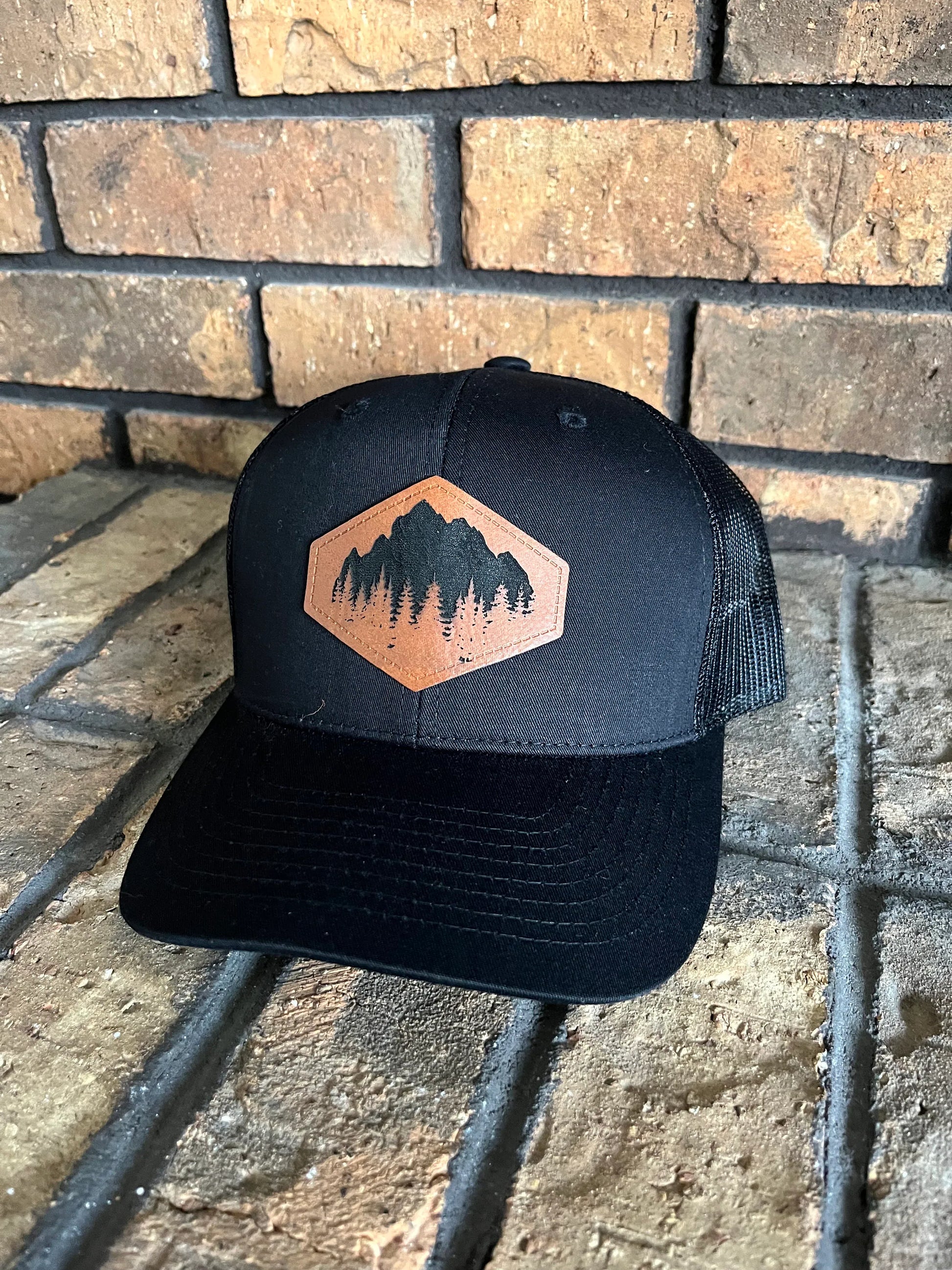 Trucker Hat with Engraved Leather Patch - Mountains
